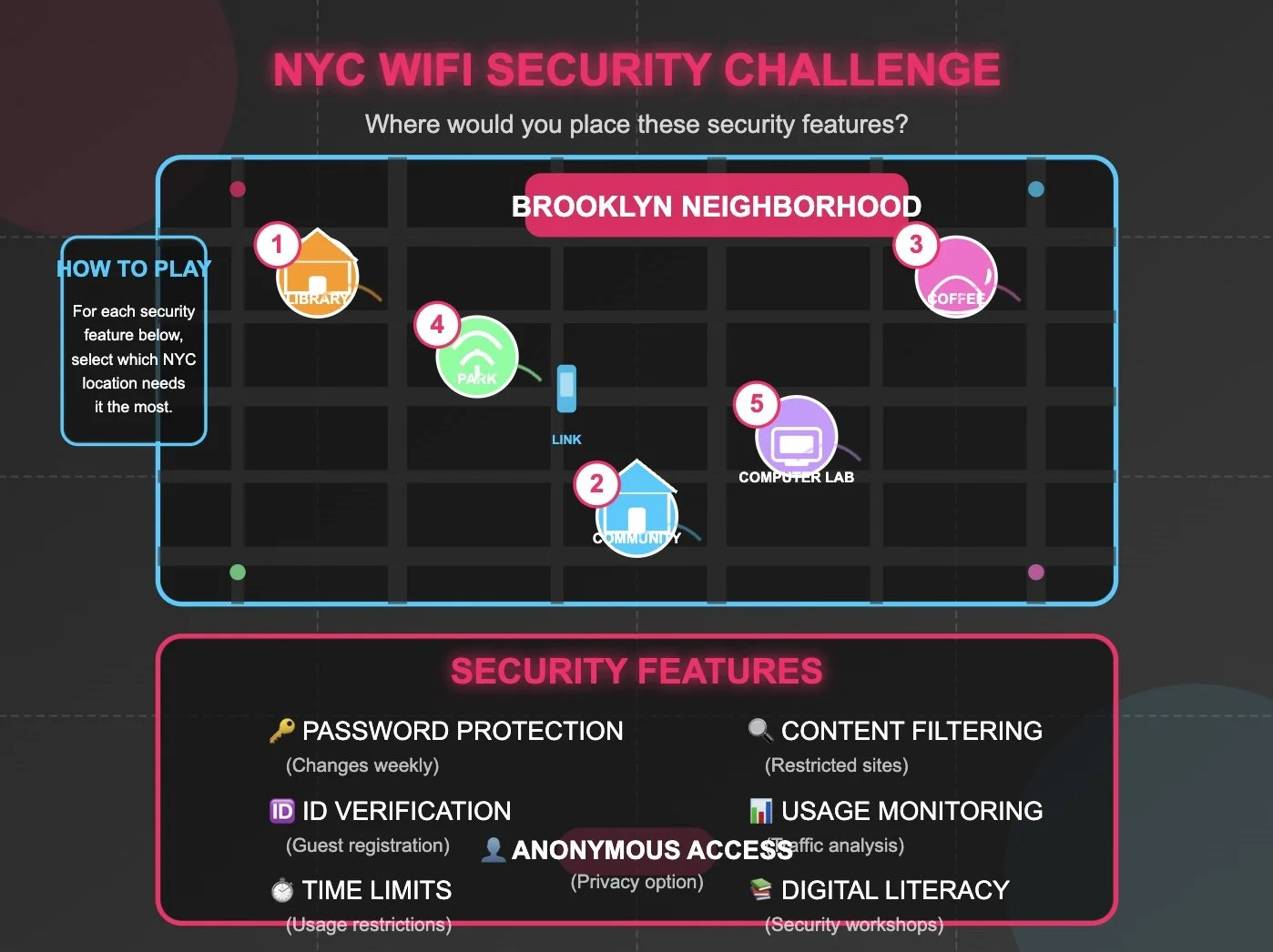 The ChallengeImagine your Brooklyn neighborhood has received funding to create five new public WiFi hotspots. As a community member, you've been invited to help design the security approach. Where would you place "Digital literacy workshops"?